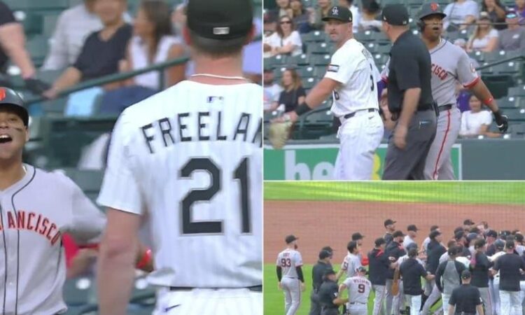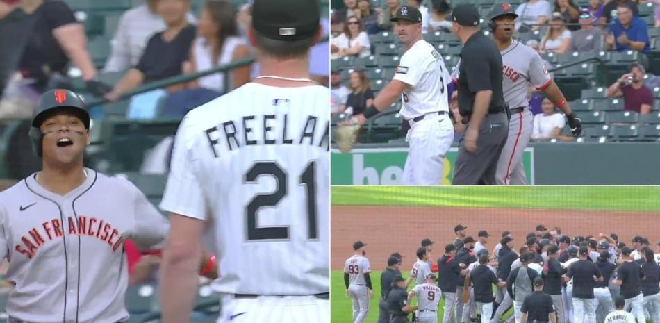 Rafael Devers y el pitcher Kyle Freeland intercambian palabras segundos después de que el dominicano le conectara de jonrón al pitcher de los Rockies