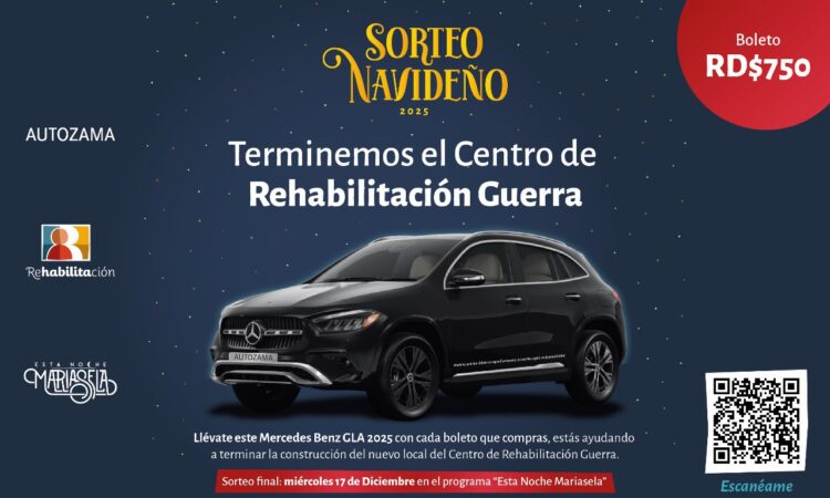 Santo Domingo, R. D. – Rehabilitación anunció el inicio de la venta de boletos para su tradicional Sorteo Navideño, que este año tiene como atractivo una jeepeta Mercedes Benz GLA 2025, donada por Autozama y valorada en US$70,000, iniciativa que busca recaudar fondos para culminar la construcción del nuevo local del centro de Guerra.