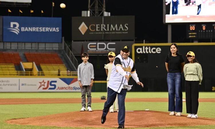 Santiago.- El presidente ejecutivo del Banco de Reservas, doctor Leonardo Aguilera, realizó este miércoles el lanzamiento de la primera bola del partido inaugural de la temporada 2025-2026 de la Liga Dominicana de Béisbol (LIDOM), efectuado en el Estadio Cibao, donde se enfrentaron las Águilas Cibaeñas y los Gigantes del Cibao.