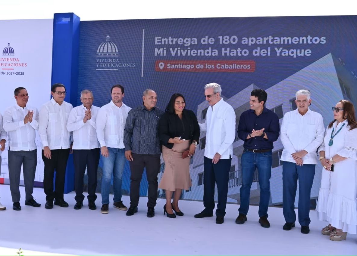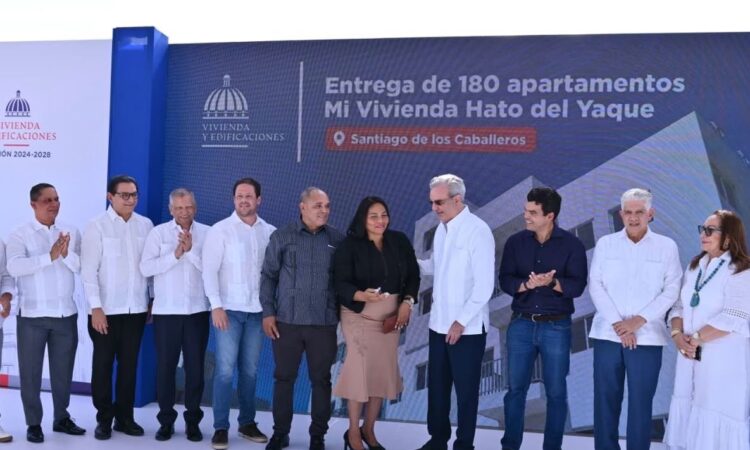 El presidente de la República, Luis Abinader, junto al ministro de Vivienda y Edificaciones (MIVED), Carlos Bonilla, entregó este sábado de 180 nuevos apartamentos del Plan Mi Vivienda en Hato del Yaque, Santiago, para beneficiar a igual número de familias.