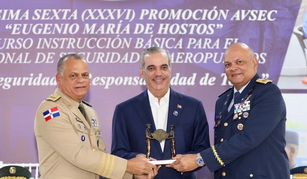 Santo Domingo.- El presidente Luis Abinader acompañado del ministro de Defensa teniente general Carlos Fernández Onofre, encabezó este jueves el acto de graduación múltiple del Cuerpo Especializado en Seguridad Aeroportuaria y de la Aviación Civil (CESAC), correspondiente a la Trigésima Sexta Promoción del Curso de Instrucción Básica para el Personal de Seguridad de Aeropuertos “Eugenio María de Hostos”, en el marco de la conmemoración del 29.º aniversario de esa institución.
